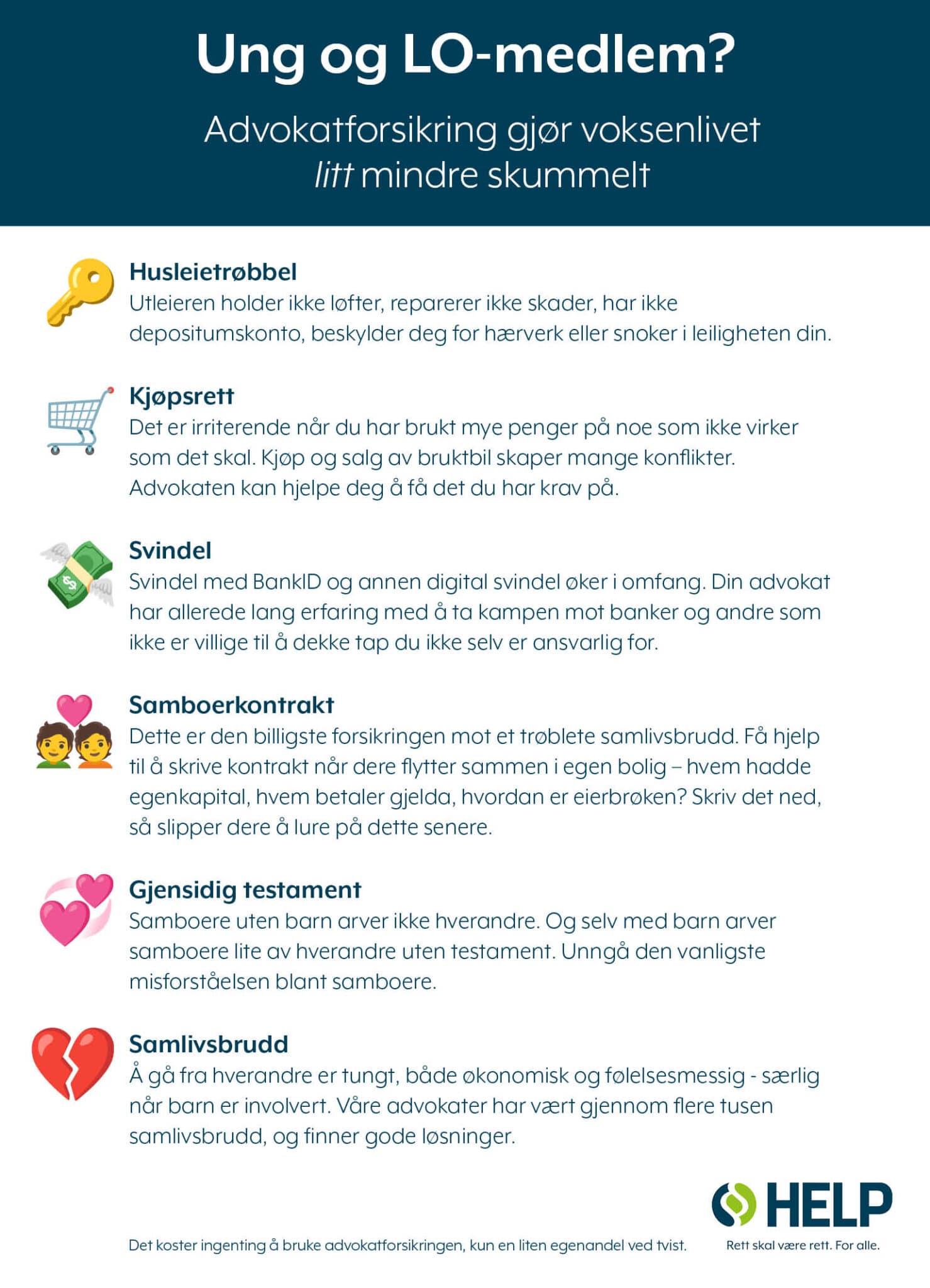Vi har forhandlet frem medlemsfordeler innen juridisk hjelp hos HELP og Advokatfirmaet Legalis. For med 1 000 000 medlemmer har vi kraften til å forhandle frem gunstige og trygge avtaler for deg i privatlivet.